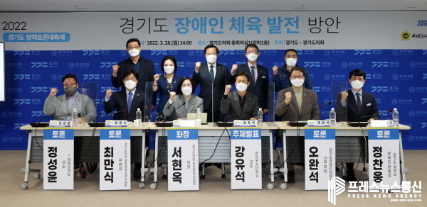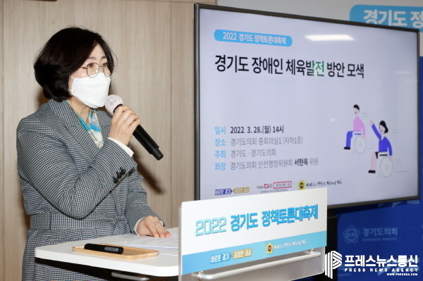 [프레스뉴스] 김대일 기자= 경기도의회 안전행정위원회 서현옥 위원(더불어민주당, 평택5)이 좌장을 맡은「경기도 장애인 체육 발전 방안 모색」토론회가 28일(월) 경기도의회 중회의실에서 개최됐다. 경기도와 경기도의회가 공동주최한‘2022 경기도 상반기 정책토론 대축제’의 일환으로, 이번 토론회는 경기도 장애인 체육 활성화 및 발전 방안 모색에 대해 논의할 필요성이 대두함에 따라 개최되었다.