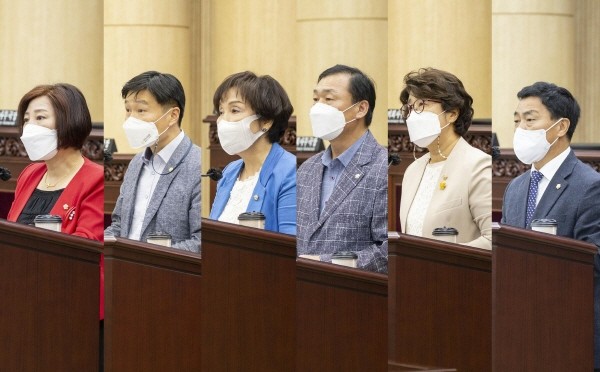 ▲ 안산시의회가 9일 제271회 임시회 제2차 본회의에서 시정질문과 5분 자유발언을 실시했다. 사진 왼쪽부터 현옥순, 김태희, 이경애, 박태순, 나정숙, 강광주 의원의 모습. 현옥순, 이경애, 박태순, 나정숙 의원은 이날 시정질문을, 강광주 의원은 5분 자유발언을 진행했으며, 김태희 의원은 시정질문과 5분 자유발언에 모두 참여했다.(사진=안산시의회) |