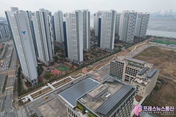 | ▲서울대 시흥캠퍼스(우측)와 아파트 사이 부지에 조성된 배곧 도시숲 전경(사진=시흥시) |