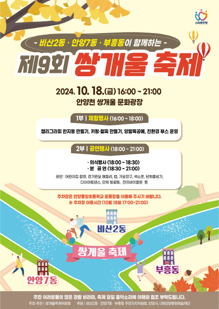 안양시 비산2동, 안양7동, 부흥동 주민들은 한자리에 모여 제9회 쌍개울 축제를 개최한다. 10월 18일 오후 4시부터 안양천 쌍개울 문화광장에서 열리는 이번 축제는 어린이들을 위한 체험 프로그램부터 어른들을 위한 공연까지 남녀노소 누구나 즐길 수 있도록 다채롭게 구성됐다. 캘리그라피, 한지등 만들기, 키링 팔찌 만들기 등 다양한 체험 부스를 통해 창의력을 키우고 E.Sivo의 특별 공연과 주민들의 열정적인 무대가 어우러져 축제의 흥을 더할 예정이다.