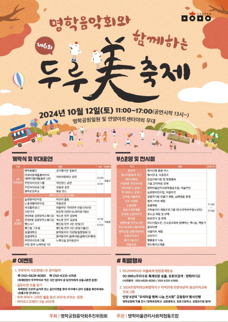 안양8동 명학공원음악회추진위원회(위원장 김형태)는 오는 10월 12일 11시 안양아트센터 야외무대(문예로36번길 16) 및 명학공원 일대(안양로 101)에서 ‘명학음악회와 함께하는 두루美축제를 개최한다.