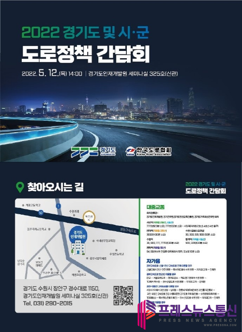 경기도는 오는 5월 12일(목) 오후 2시 수원 경기도 인재개발원에서 도 및 도내 31개 시군 도로정책과장들을 초청하여 ‘2022년 경기도 및 시군 도로정책 간담회’를 개최한다고 밝혔다.