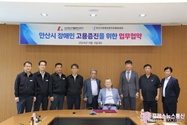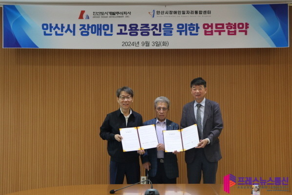 [프레스뉴스] 장현준 기자= 안산시(시장 이민근)는 지난 3일 안산도시개발에서 안산시장애인일자리통합센터와 안산도시개발이 장애인 일자리 고용증진을 위한 업무협약을 체결했다고 4일 밝혔다.