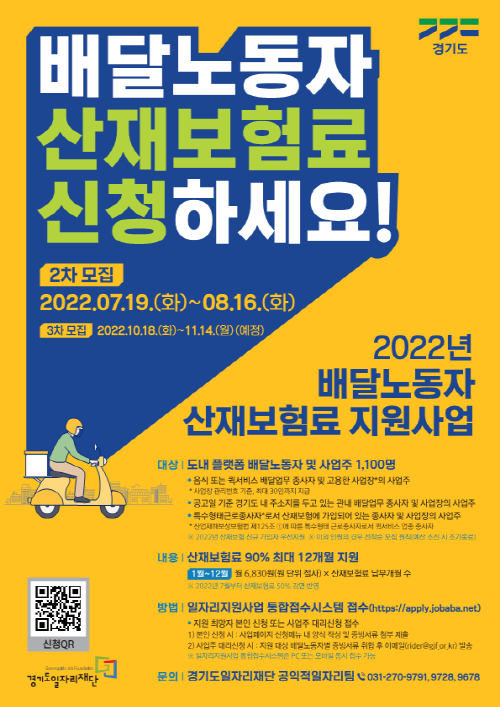 | ▲ 2022 배달노동자 산재보험 지원사업 2차 모집 포스터(사진=경기도일자리재단) |
