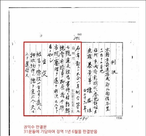 | ▲권익수 판결문(경성지방법원, 1921.11.2)사진=경기도 |