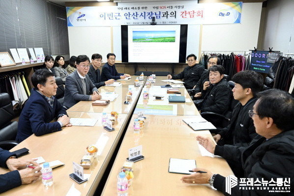 | ▲ 이민근 안산시장이 지난 8일 합성피혁 전문기업 ㈜디케이앤디를 방문해 최민석 ㈜디케이앤디 대표이사 및 관련부서장 등 참석한 가운데 간담회가 열리고 있다.(사진=안산시) |