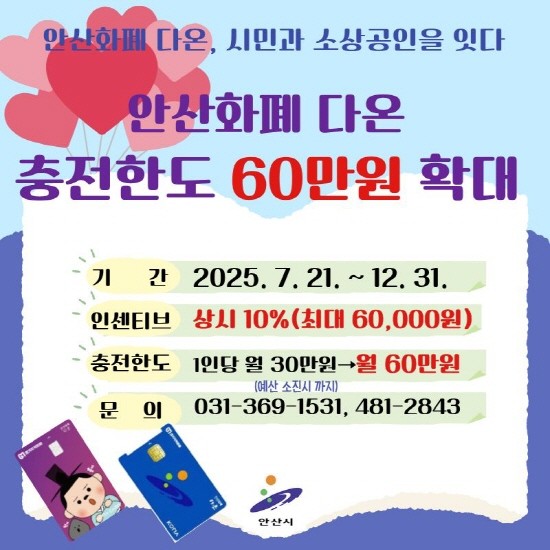 [프레스뉴스] 장현준 기자= 안산시(시장 이민근)는 오는 21일부터 지역화폐인 안산 화폐 ‘다온’의 월 충전 한도를 기존 30만 원에서 60만 원으로 두 배 상향 조정한다고 18일 밝혔다.