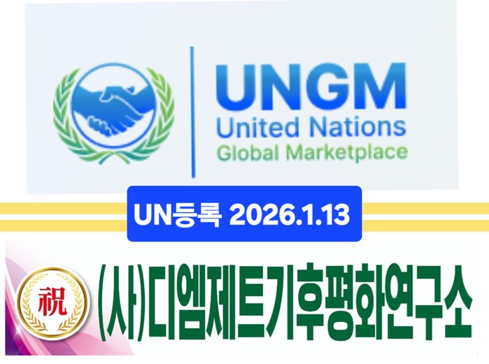 [프레스뉴스] 강래성 기자= 사단법인 디엠제트기후평화연구소(소장 이차복)는 국제연합(UN) 조달 통합 플랫폼인 UNGM(United Nations Global Marketplace) 기본 등록(Basic Level)을 1월13일 완료하고, 총 29개 UN 산하기관 및 국제기구에 공식 공급업체로 등록됐다고 밝혔다.