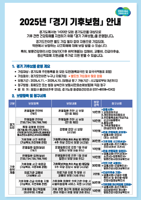 ‘경기 기후보험’은 경기도에서 올해 4월 11일 전국 최초로 시작한 기후 관련 건강피해 보장 정책보험으로, 모든 경기도민은 ‘경기 기후보험’에 자동으로 가입돼 피해 시 신청 만으로 보험금을 받을 수 있다.