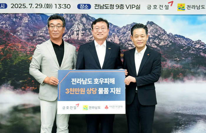 [전남=프레스뉴스] 강래성 기자= 전라남도는 금호건설㈜이 집중호우로 큰 피해를 본 전남지역 주민과 자원봉사자를 돕기 위해 3천만 원 상당 물품을 기탁했다고 밝혔다.