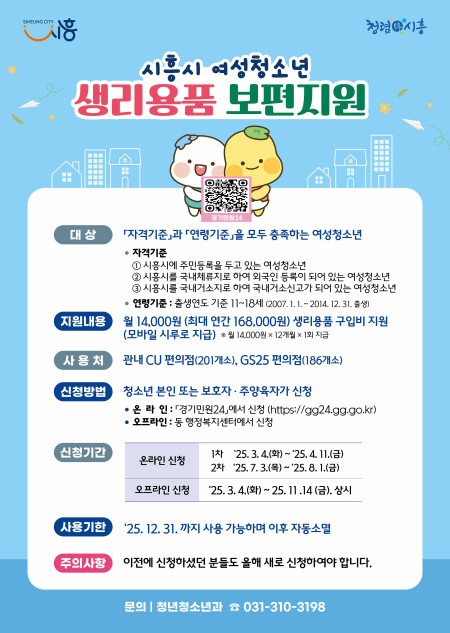 [프레스뉴스] 장현준 기자= 시흥시(시장 임병택)가 3월 4일부터 ‘2025년도 시흥시 여성청소년 생리용품 보편지원 사업’ 신청을 받는다.