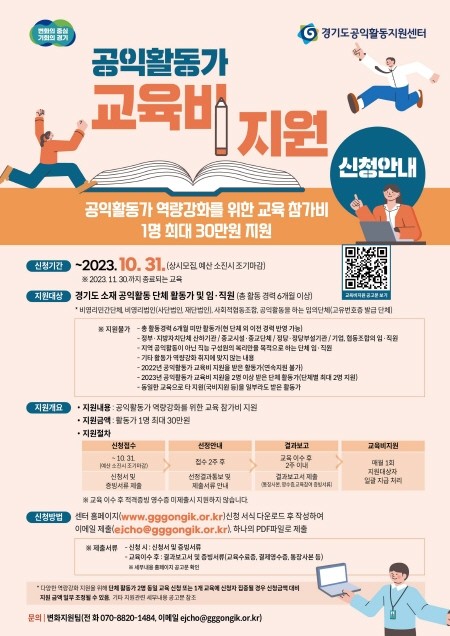 문의 사항은 공익활동지원센터 누리집의 ‘2023년 공익활동가 교육비 지원’ 공고문을 확인하거나, 공익활동지원센터 변화지원팀으로 문의하면 된다.