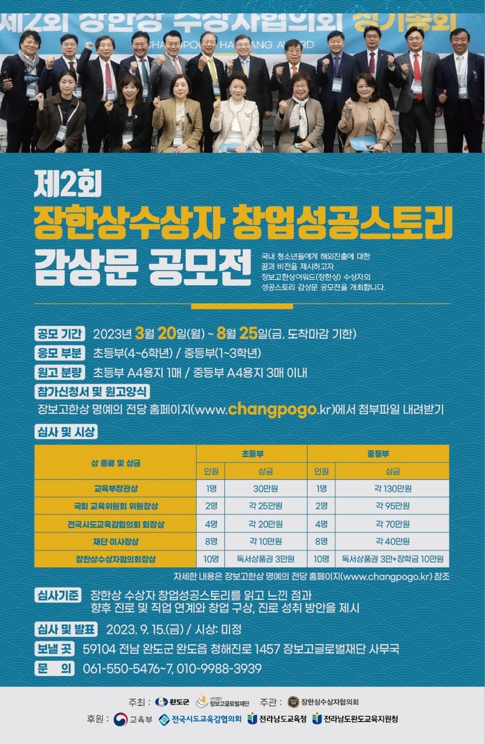 | ▲ 제2회 장한상 수상자 성공 스토리 감상문 공모전 안내 포스터 (사진제공=완도군) |
