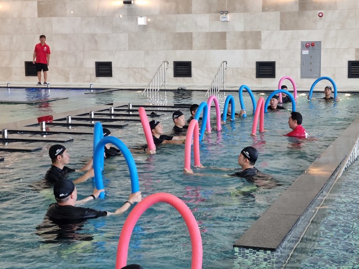 | ▲완도 해양치유터 프로그램-딸라소풀 수중 운동을 하는 모습(사진제공=완도군) |