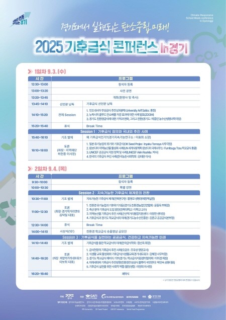 콘퍼런스는 기조 강연과 세션 발표, 토론으로 구성된다. 첫날에는 기조 강연과 함께 세션 1 ‘기후급식 정의와 국내외 추진 사례가 진행되며, 일본·인도네시아 등 해외 전문가와 유니세프(UNICEF)가 참여해 각국의 사례를 공유한다. 둘째 날에는 세션 2 ‘지속가능한 기후급식 체계로의 전환’(저탄소 식단, 지역 먹거리 순환 등)과 세션 3 ‘세상을 건강하게 바꾸는 기후급식’(공공급식 확대, 정책 제안)이 이어지고, 발표 후 토론으로 마무리된다.