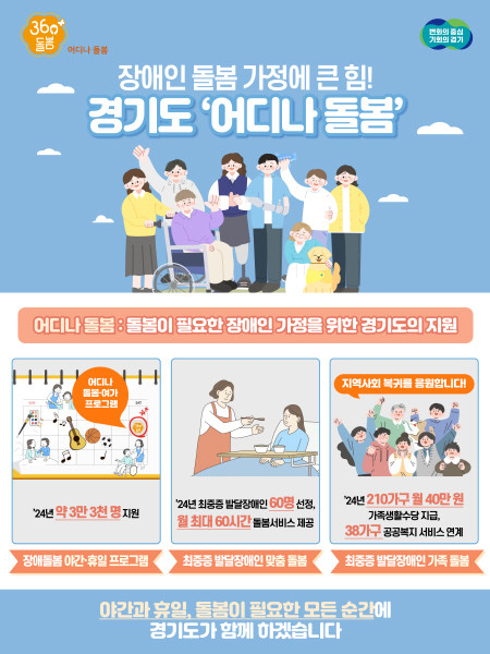 [프레스뉴스] 장현준 기자= 경기도가 올해 새롭게 장애인 돌봄공백 해소를 위한 ‘어디나 돌봄’ 3개 사업을 실시해 돌봄 서비스 제공, 가족생활수당 지원 등 돌봄 욕구가 있음에도 그간 충분한 지원을 받지 못한 장애인들에게 큰 힘이 됐다고 11일 밝혔다.