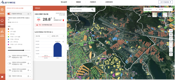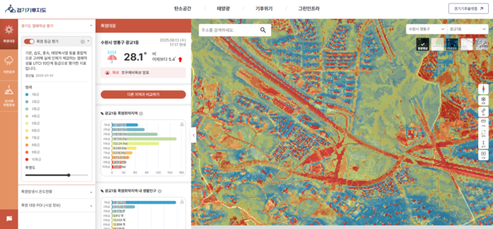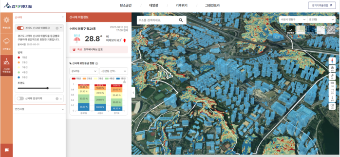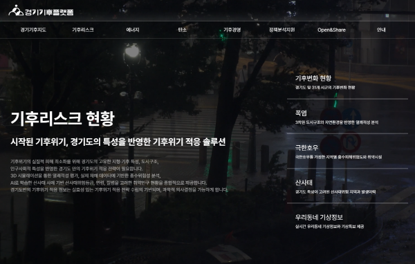 올해 7월 28일 서비스를 시작한 ‘경기기후플랫폼’(climate.gg.go.kr)은 항공 LiDAR(라이다), 위성 영상, 인공지능(AI), 빅데이터 등 기술을 활용해 구축된 온라인 기후·환경·에너지 종합 정보 플랫폼이다. 이를 통해 기후변화로 인한 각종 재난 위험 정도를 한눈에 확인할 수 있다.