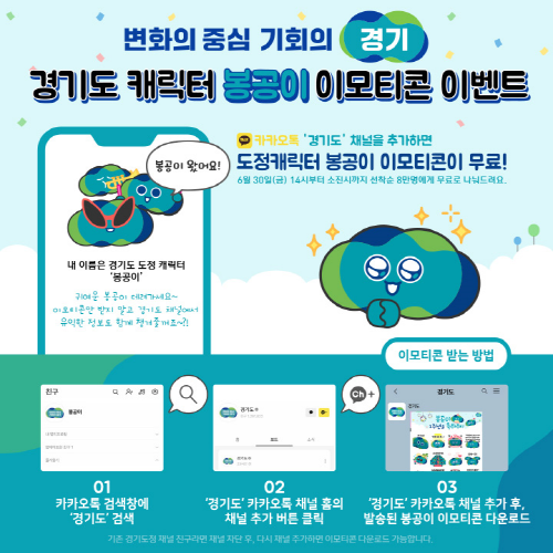 봉공이 이모티콘은 29일 오후 2시부터 카카오톡 경기도 채널을 신규로 추가하면 무료로 지급하는데 기존 구독자라도 채널을 차단한 후 다시 추가하면 이모티콘을 받을 수 있다. 이모티콘은 총 8만 명에게 선착순으로 배포하고, 내려받기 후 30일 동안 사용할 수 있다.