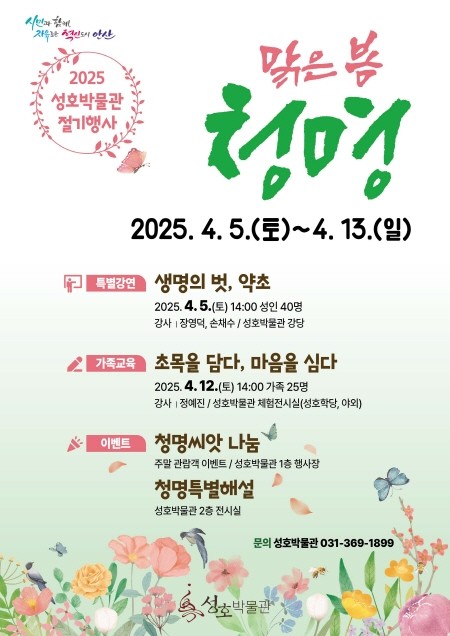 한편, 행사 기간인 다음 달 5일부터 13일까지 성호박물관을 찾는 관람객에게는 상설전시실에서 청명과 관련한 특별해설을 들을 기회가 제공된다. 주말에 방문하는 관람객에게는 ‘청명 씨앗 나눔 이벤트’도 진행된다. 성호박물관과 성호공원(안산식물원)을 이어서 방문하고 인증이 완료되면 작물 등의 씨앗과 박물관 굿즈를 받을 수 있다.