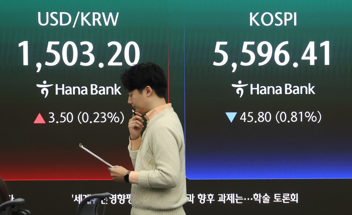 | ▲ 26일 서울 중구 하나은행 딜링룸 전광판에 코스피 시황이 표시되고 있다. 이날 코스피는 전 거래일 대비 0.85% 하락한 5594.06으로 출발했다. /사진=뉴스1 |