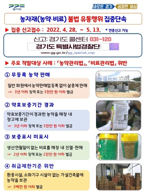 [프레스뉴스] 장현준 기자= 경기도 특별사법경찰단은 농자재 안전성 확보와 건전한 유통 질서 확립을 위해 4월 28일부터 5월 13일까지 농약· 비료 등 농자재 관련 불법 유통행위를 집중 수사한다.