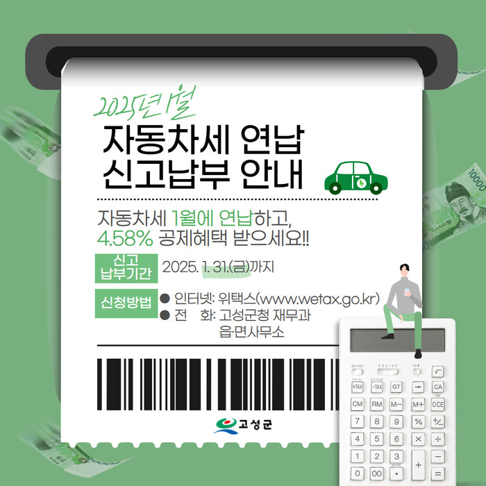 | ▲고성군(군수 이상근)은 2025년 자동차세 연납 신청을 1월 31일까지 접수한다. (사진=고성군) |