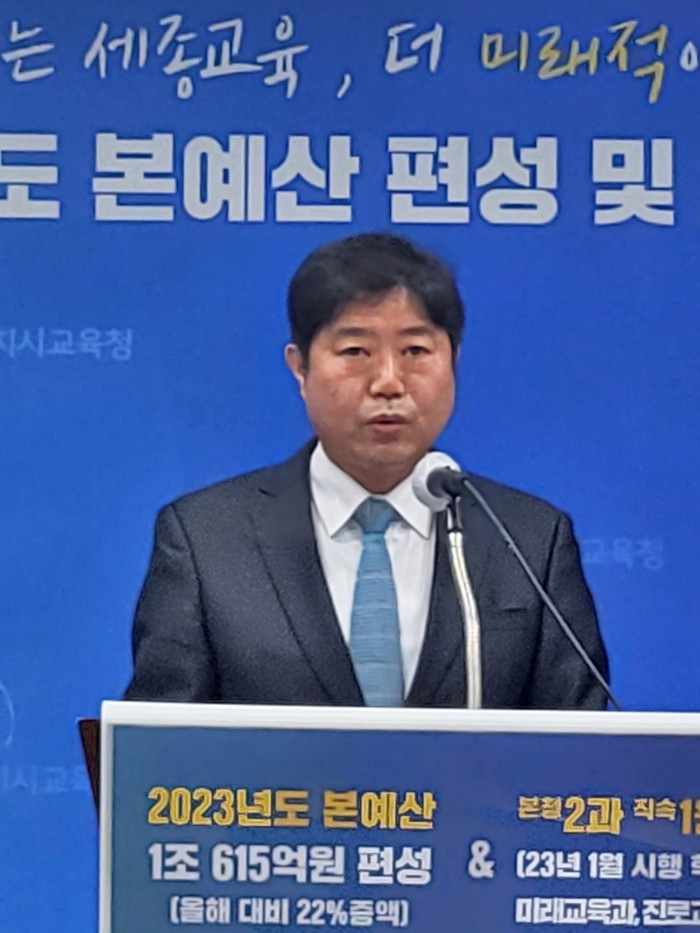 ▲세종시교육청은 8일 기자회견을 열고 서한택 기획조정국장이 23년 본예산 편성에 대해 설명했다.(사진=김교연기자) |