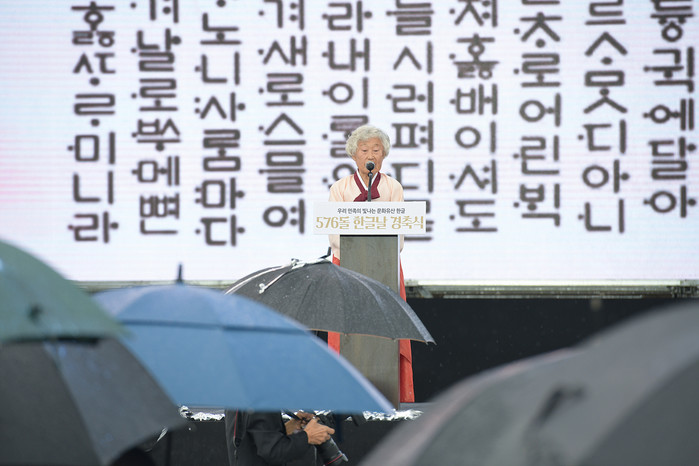 ▲ 세종시 한글날 경축식에서는 늦은 나이에 한글을 배우고 계신 양정자(82)씨가 훈민정음 머리글을 읽으면서 한글날의 의미를 더했다.(사진=세종시) |