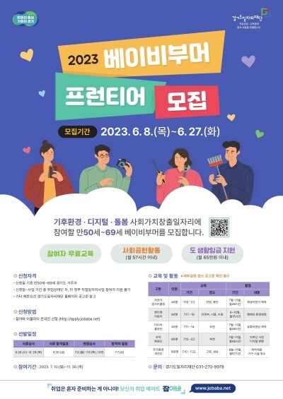 신청일 기준 만 50~69세 미취업 상태인 경기도민이면 누구나 신청할 수 있다. 사업 참여를 희망하는 베이비부머는 6월 8일부터 27일까지 경기도일자리재단 잡아바어플라이에서 온라인으로 신청하면 된다. 이후 신청자를 대상으로 서류심사와 면접 심사를 거쳐 최종 대상자를 발표할 예정이다.