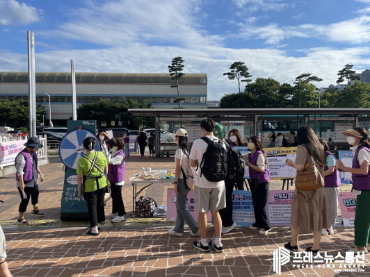이들은 ▲데이트폭력 및 스토킹 범죄 통념 OX퀴즈 ▲디지털 성범죄 바로알기 OX퀴즈 ▲불법촬영 근절 동참인증 사진 찍기 ▲불법촬영을 감지하는 방지카드 제작 배부 ▲성폭력·가정폭력 근절 피켓 전시와 함께 관련 리플릿을 배부·홍보하며 예방 동참을 독려했다.