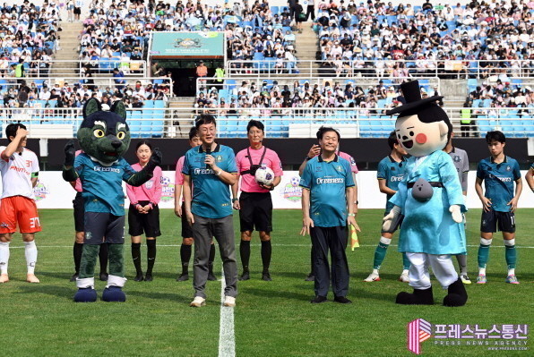 ▲이민근 안산시장(앞줄 왼쪽 두번째)이 안산와~스타디움에서 진행된 ‘뭉쳐야 찬다4’ 첫 직관 경기에서 인사 발언을 하고 있다.(사진=안산시) |