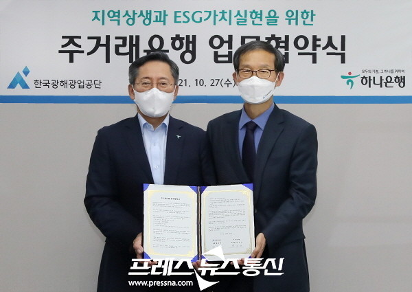 [프레스뉴스] 김대일 기자= 하나은행(은행장 박성호)은 지난 27일 한국광해광업공단(사장 황규연)과 지역 상생 및 ESG 경영 공동 추진을 위한 업무협약을 체결하고 동반성장을 위한 다양한 협업에 나선다고 밝혔다.