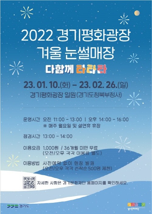 이와 함께 경기평화광장 잔디광장에서는 1월 10일부터 2월 26일까지 40일간 ‘눈썰매장’을 운영한다. 이번 행사는 코로나 여파로 인해 2년 만에 개장하는 것으로 주말을 포함하여 오전 11시부터 오후 4시까지 1회당 120분씩 2회에 걸쳐 운영되며(점검시간: 13시부터 14시), 매주 월요일에는 휴장한다.