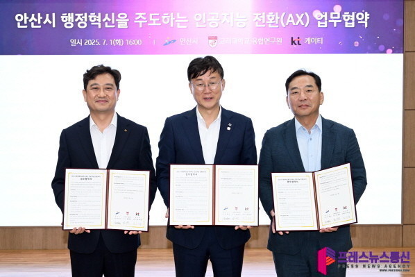 [프레스뉴스] 장현준 기자= 안산시(시장 이민근)는 지난 1일 시청 제1회의실에서 고려대학교, KT와 함께 ‘행정혁신을 주도하는 인공지능 전환(AX) 업무협약식’을 개최했다고 2일 밝혔다. 인공지능 전환(Artificial Intelligence Transformation)은 조직이나 산업 전반에 인공지능 기술을 도입해 혁신과 효율성 제고를 꾀하는 전환을 의미한다.