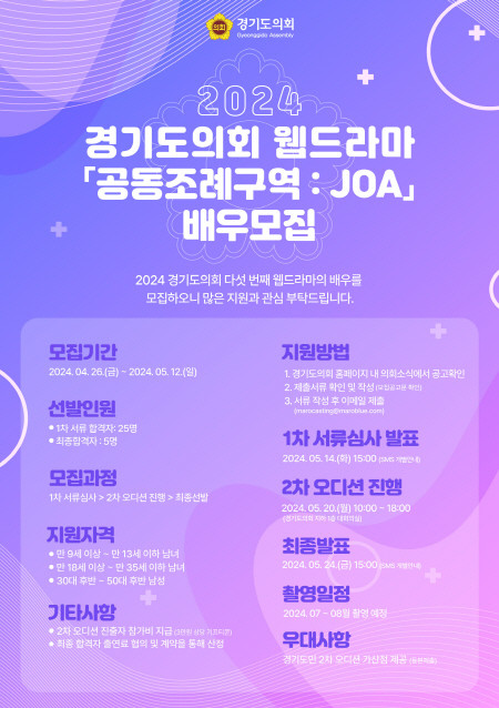 [프레스뉴스] 류현주 기자= 경기도의회(의장 염종현)가 2024년도 경기도의회 웹드라마 「공동조례구역: JOA」의 도민 관심을 높이기 위해 배우 공개 오디션을 진행한다.