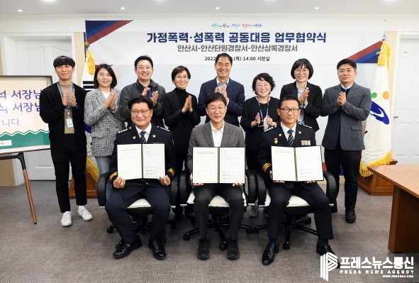 | ▲ 이민근 안산시장 20일 시청 시장실에서 열린 안산시-단원경찰서-상록경찰서,가정폭력·성폭력 공동대응을 위한 업무협약을 체결하고 참석자들과 기념촬영을 하고 있다.(2022.10.20)사진=안산시 |