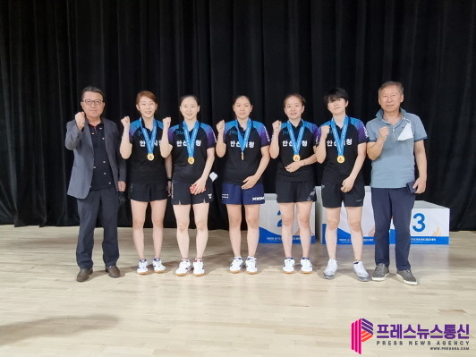 | ▲ 안산시청 여자 탁구부가 제 68회 경기도체육대회 여자탁구 단체전에서 우승 후 기념촬영을 하고 있다.(사진=안산시) |