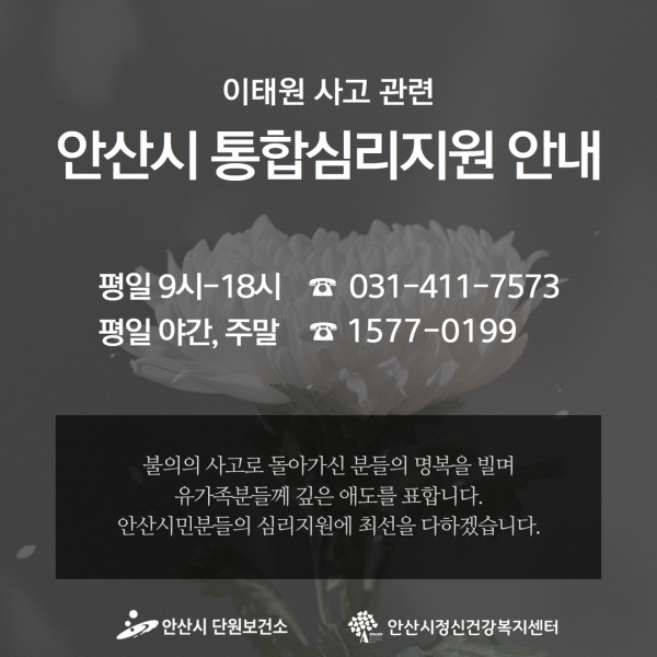 이민근 시장은“갑작스러운 사고에 깊은 애도를 표하며 이번 사고로 심리적 어려움을 겪는 시민들이 심리상담을 통해 원활히 일상으로 복귀하는데 도움이 되길 바란다”고 말했다.