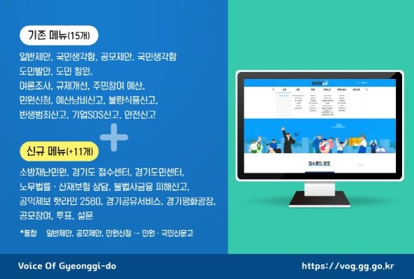 지난 2019년 1월부터 운영해온 경기도의 소리는 정책 제안과 발안, 공모제안, 각종 민원·청원 등을 할 수 있는 통합 플랫폼이다. 도는 4년 만의 개편을 통해 도민이 참여하고 지원받을 수 있는 제도를 쉽게 활용할 수 있도록 15개의 참여 창구를 24개로 확대했다.