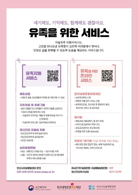 한편 자살 유족 지원서비스에 대한 궁금한 사항은 안산시자살예방센터로 문의하면 안내받을 수 있다.