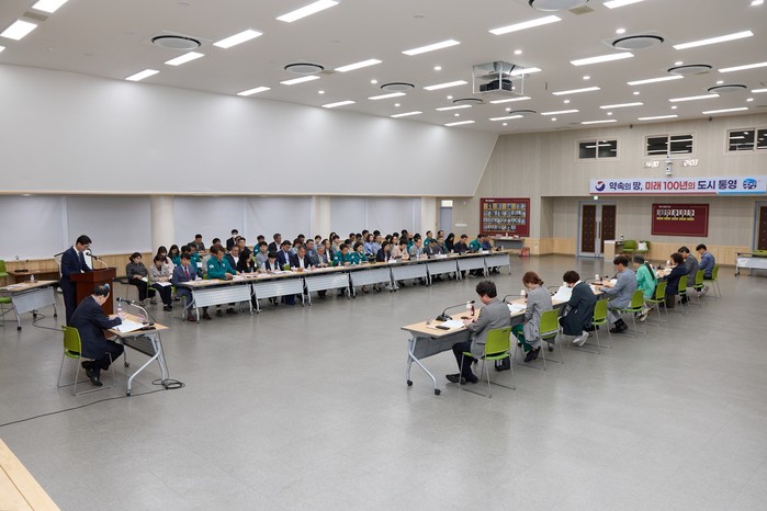 이어진 기획예산실장의 총괄설명으로는 분야별 추진현황, 예산확보 현황과 「KTX 통영역세권 개발 및 배후도시 조성사업」, 「최첨단 현대식 수산물 유통센터건립」 및 「아동보호전문기관 설치」등 주요 공약사업에 대한 설명이 있었다.
