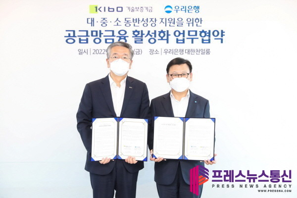 [프레스뉴스] 김대일 기자= 우리금융지주의 자회사 우리은행(은행장 이원덕)은 지난 27일 우리은행 본점에서 이원덕 우리은행장, 김종호 기술보증기금 이사장과 양 기관 관계자들이 참석한 가운데‘공급망금융 활성화 포괄적 업무협약’을 체결했다고 30일 밝혔다.