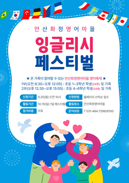 참가신청은 안산화정영어마을 누리집(홈페이지)에서 선착순으로 접수 받으며, 관내 초등학교 1~6학년 및 가족 구성원이 함께 참여할 수 있다.