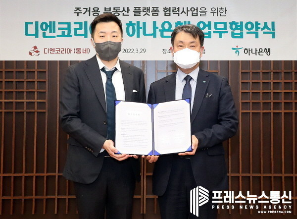 [프레스뉴스] 김대일 기자=하나은행(은행장 박성호)은 29일 오후 을지로 하나은행 본점에서 부동산 전문 핀테크기업 ㈜디엔코리아(대표 매튜 샴파인 / 한국명 차민규)와 ‘주거용 부동산 플랫폼 협력사업’을 위한 업무협약(MOU)을 체결했다고 밝혔다.
