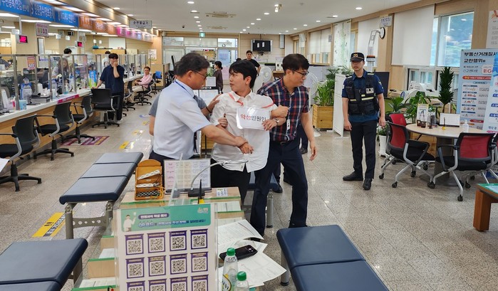 훈련은 자동차 번호 변경 신청을 위해 방문한 민원인이 민원 처리 도중 공무원에게 폭언 및 폭력을 가하는 상황을 가정해 이뤄졌다.