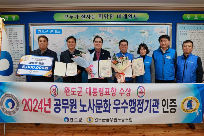 [전남=프레스뉴스] 박정호 기자= 전남 완도군과 완도군공무원노동조합이 행정안전부가 주관하는 ‘2024년 공무원 노사 문화 우수 행정기관 인증제’에서 전국 기초자치단체 부문 1위를 차지하며 지난 4일 ‘대통령 표창’을 수상했다.