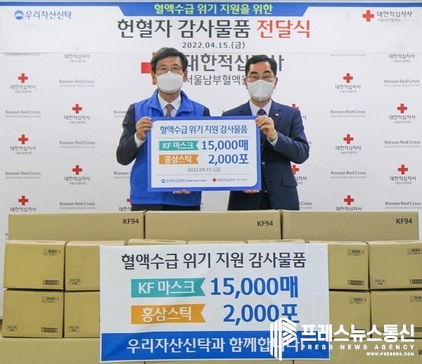 [프레스뉴스] 김대일 기자= 우리금융그룹의 종합부동산금융 자회사인 우리자산신탁(대표이사 이창재)은 코로나19로 인한 혈액수급 위기극복에 동참하는 헌혈자 지원을 위해 KF94 마스크와 건강식품 등을 대한적십자사 서울남부혈액원에 후원했다고 18일 밝혔다.