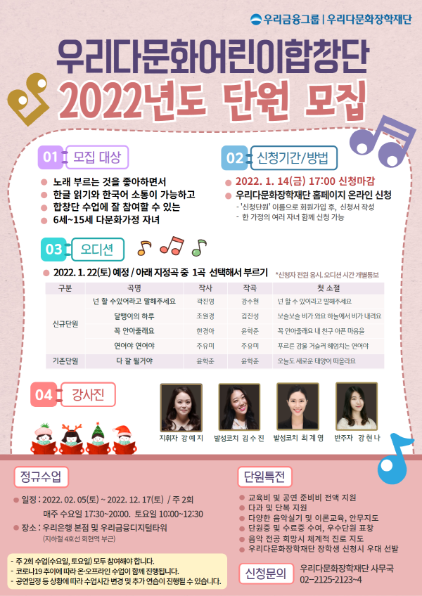 신청대상은 노래를 좋아하고 음악에 소질이 있는 6세~15세 다문화자녀이며, 다음 달 14일까지 우리다문화장학재단 홈페이지를 통해 신청가능하다. 오디션을 거쳐 총 50명을 선발하며, 내년 2월부터 매주 수요일·토요일에 우리은행 본점과 우리금융디지털타워에서 교육이 진행된다. 사회적 거리두기 지침에 따라 온·오프라인으로 병행해 수업을 진행할 예정이다.