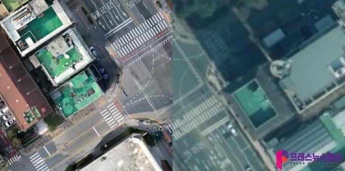 | ▲만안구청 앞 사거리 드론지도(왼쪽)와 위성지도(오른쪽)사진=안양시 |