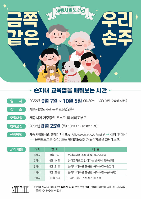 이번 강좌는 세종시 거주 중인 조부모, 예비조부모 누구나 수강 가능하며, 세종시립도서관 누리집과 현장방문신청을 통해 다음달 6일까지 선착순 15명을 모집한다.